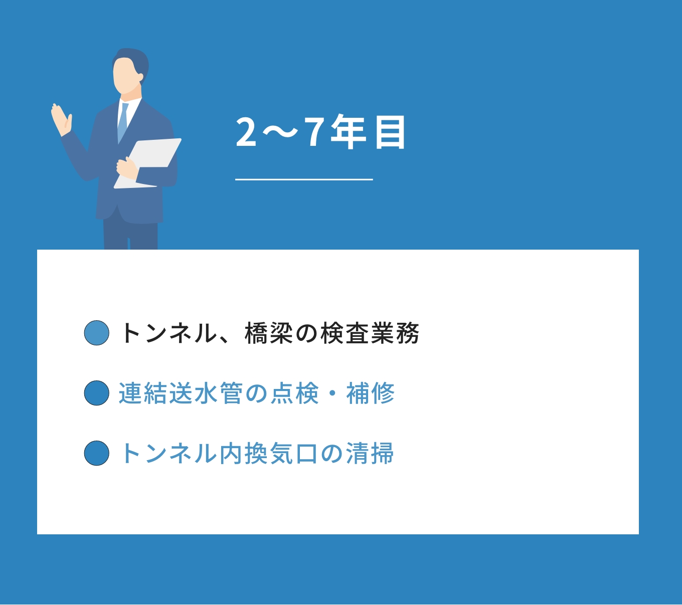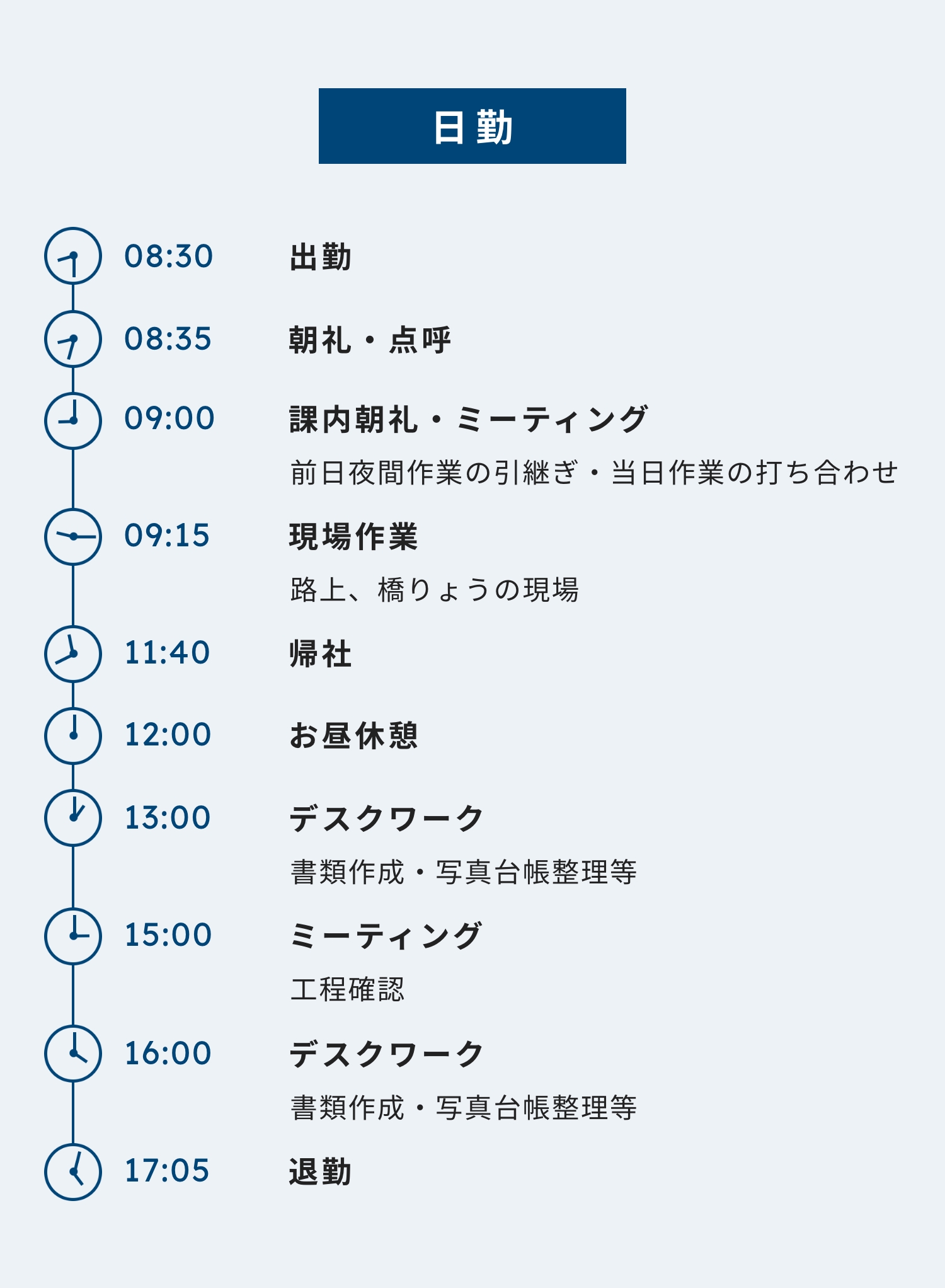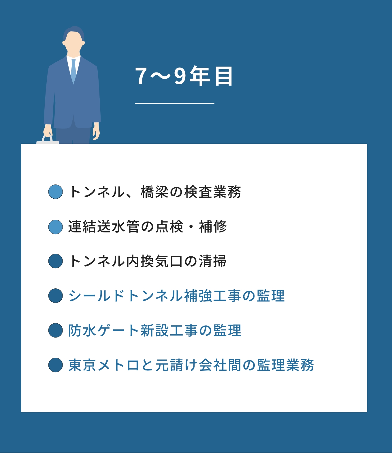 構造物検査、保守点検、設計工事の設計/監理などの業務に携われます。