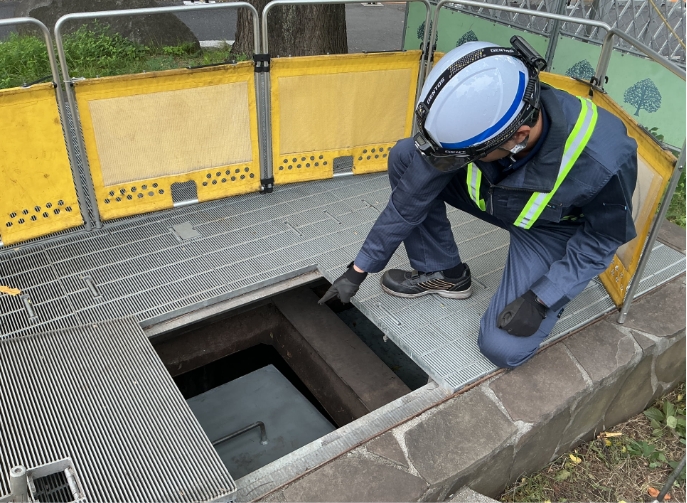 地上歩道部の換気口は、常時にはトンネル内に換気のため開扉し、台風や豪雨時にはトンネル内への浸水を防ぐため閉扉する浸水防止機を設けています。年2回の定期点検に加えて、毎月遠隔操作による動作確認を行い、浸水対策に備えています。
