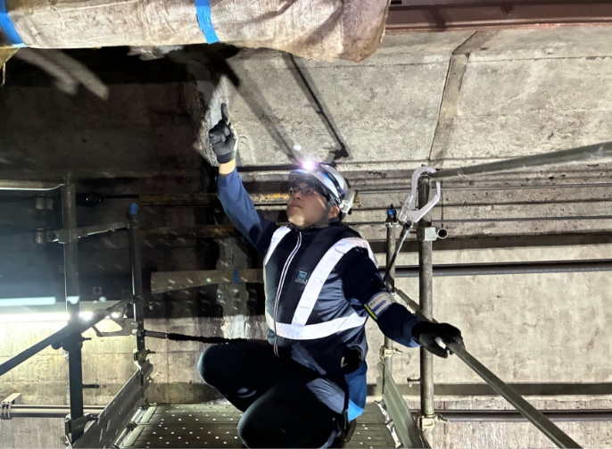 東京メトロの橋りょうの細密点検を定期的に行い、変状の有無、程度、補修の必要性について目視、打音による判定を行い、変状については東京メトロ担当者と共有・確認を行い、補修計画の立案・補修施工を実施し列車の安全運行及びお客様の安全確保に努めています。