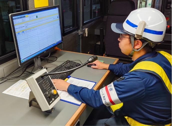軌道四項目を測定する「軌道検測車」に同乗し、測定データの収集と解析を行います。
